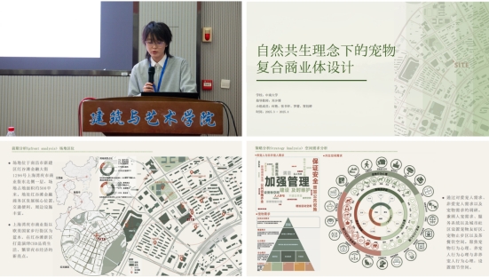 在毕业设计中期汇报环节,来自各高校的10组学生代表依次上台,各组围绕选题从场地调研、选题思路、设计内容、当前进展等方面进行了10分钟的精简汇报。各组汇报后,由三位专家进行3-5分钟的点评,从专业角度为学生们提出了专业的指导和后续设计深化的方向。其中,来自酷爱成人网 的两组同学分别进行了《豫章文化背景下生活集合店商业空间设计》和《自然共生理念下的宠物复合商业体设计》的主题汇报,得到了专家的高度赞赏和认可。