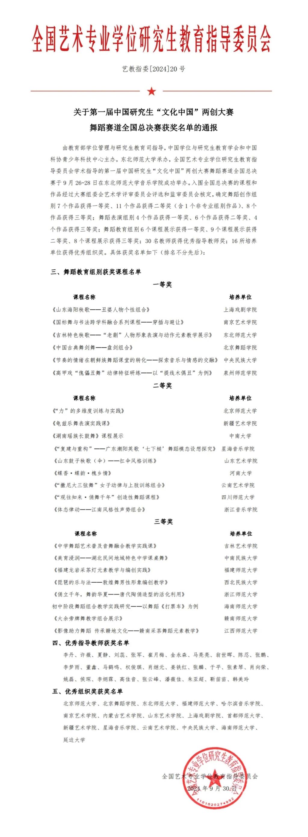 中国研究生“文化中国”两创大赛是中国研究生创新实践系列大赛主题赛事之一,是系列大赛中首个文科主题的创新实践公益性赛事。大赛由教育部学位管理与研究生教育司、全国艺术专业学位研究生教育指导委员会指导,中国学位与研究生教育学会和中国科协青少年科技中心主办,首届大赛舞蹈赛道由东北师范大学承办。据悉,初赛共有专业组62所培养单位报送的369个作品,经过初评共有83个舞蹈作品、45堂舞蹈教育课程展示入围全国总决赛,经决赛确定舞蹈创作组、舞蹈表演组、舞蹈教育组三类获奖名单。其中舞蹈教育组确定6名一等奖、9名二等奖、8名三等奖,我校《湖南瑶族长鼓舞》精品课程荣列其中。