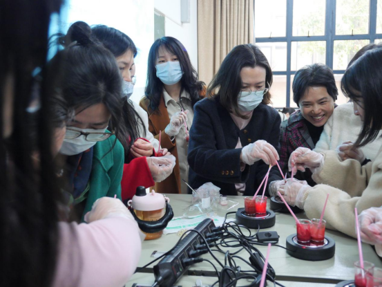 "三八"国际劳动妇女节口红DIY活动沐光启幕。校工会女工委员、院党委委员、副院长刘雪梅,副院长李志榕亲临现场,与女职工共赴这场色彩盛宴,共同见证“破茧”时刻。