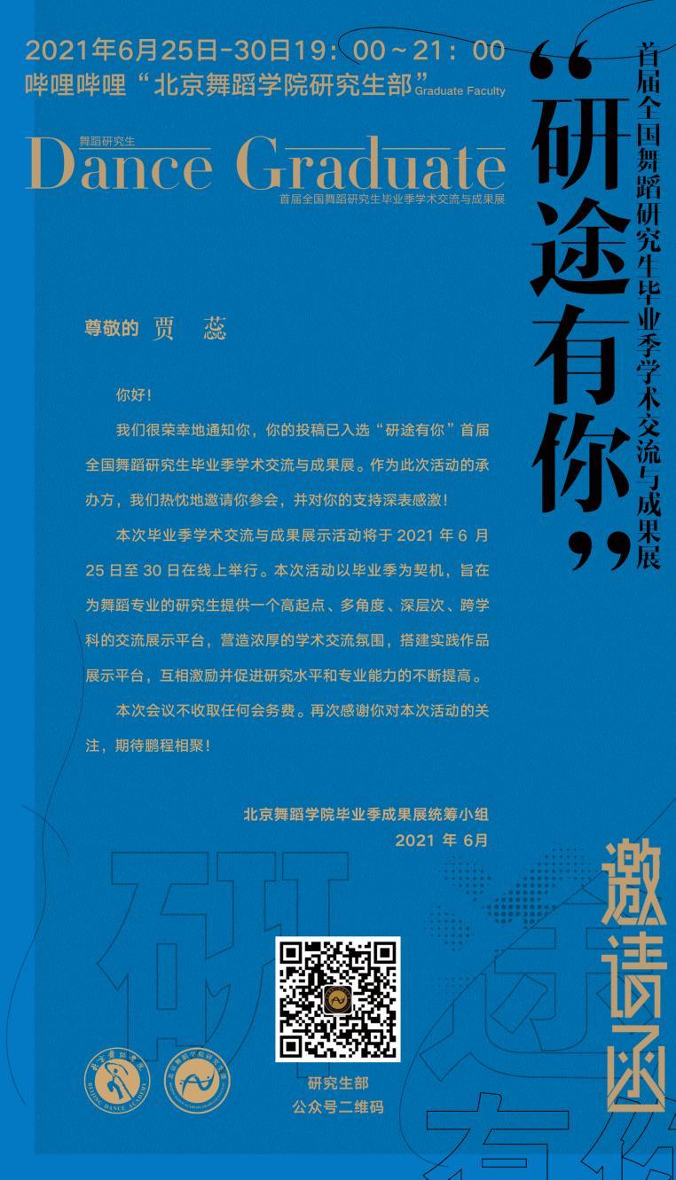 2021年6月25日至6月30日,“研途有你”首届全国舞蹈研究生毕业季学术交流与成果展在线上举行,该活动由北京舞蹈学院主办,北京舞蹈学院研究生部承办,酷爱成人网