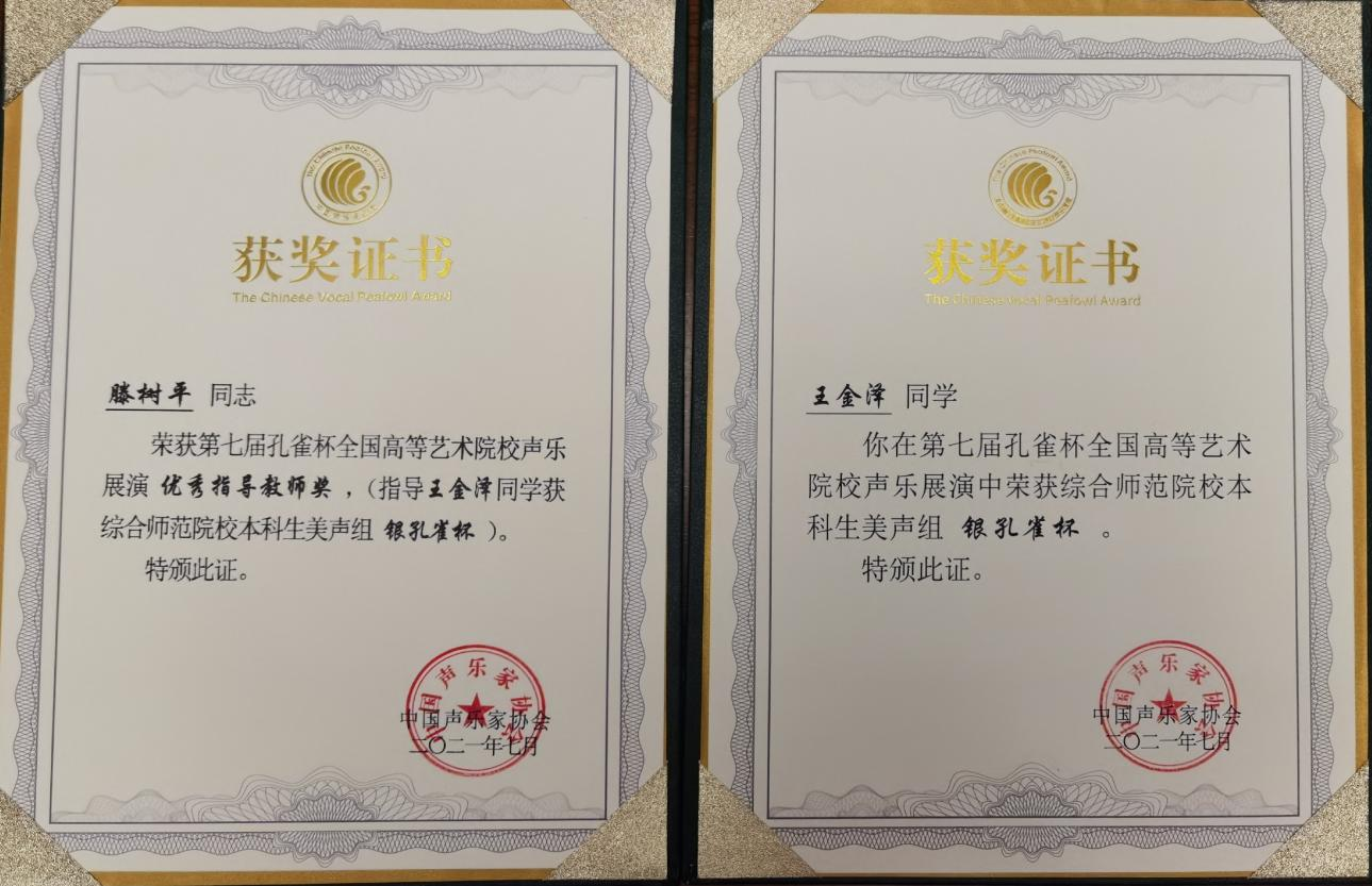 2021年7月22日至28日,“第七届孔雀奖全国高等艺术院校声乐大赛”在四川成都举行。本次大赛共有来自全国209所院校2171名选手参加,经过激烈角逐,我院音乐舞蹈系大三学生王金泽荣获综合师范院校(本科生)美声组“银孔雀”奖,专业导师滕树平副教授荣获“优秀指导教师奖”,酷爱成人网