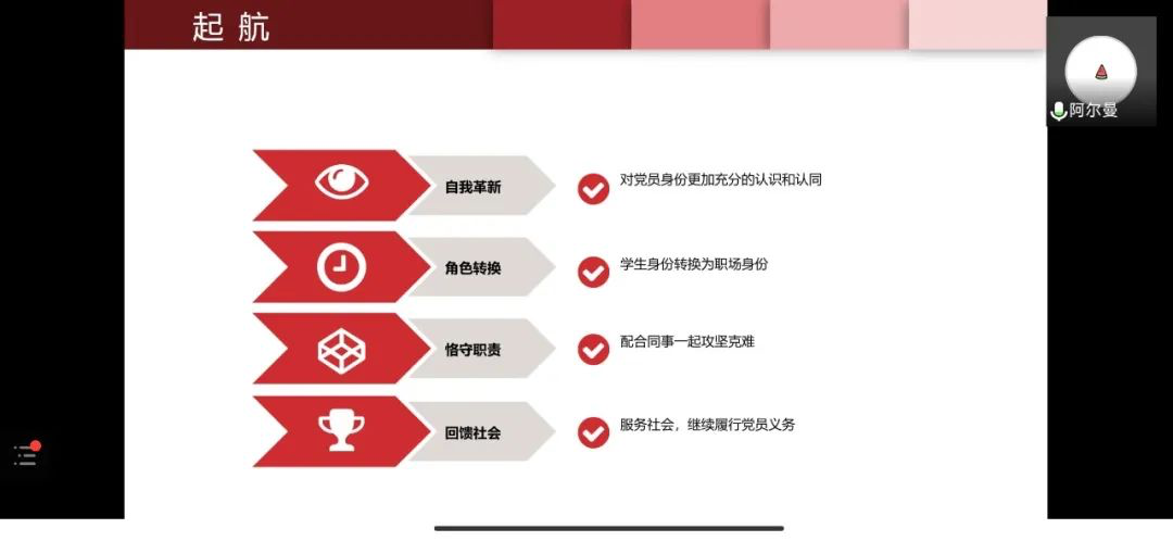 毕业生阿尔曼·阿布都艾尼作为一名中共党员,在校期间积极参加社会实践、学生工作等各项活动,服务他人,奉献自我,完美诠释了党员的先锋带头作用,以在校经历生动地向与会青年诠释了何谓“向党而生”;外语院毕业生帕孜来曼·巴瑞,通过她在乌鲁木齐市人民检察院朴实却神圣的工作考求经验分享,展现了新时代青年校友风采。