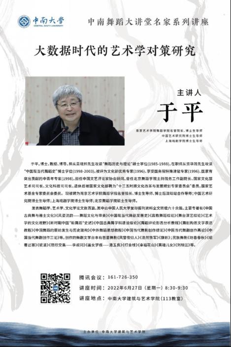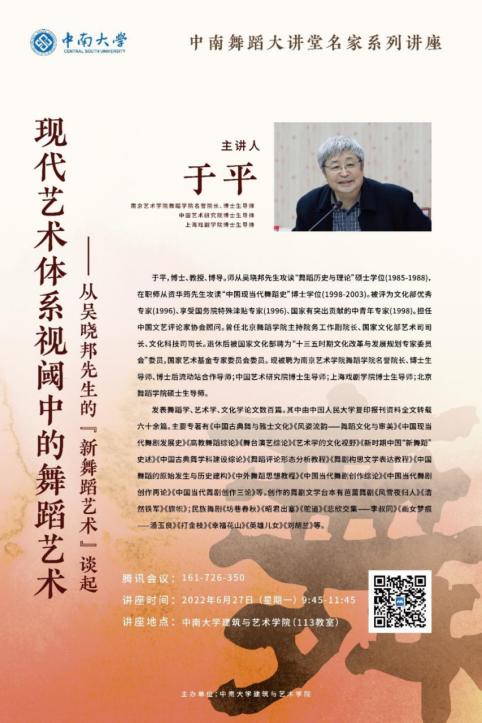 特别邀请南京艺术学院舞蹈学院名誉院长、博士生导师、中国艺术研究院博士生导师、上海戏剧学院博士生导师于平教授,于6月27日上午在腾讯会议云端进行《大数据时代的艺术学对策研究》《现代艺术体系视阈中的舞蹈艺术——从吴晓邦先生的“新舞蹈艺术”谈起》两场专题讲座。酷爱成人网