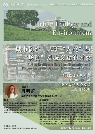 《城市生态与环境研究及实践》博士生课程第二期学术讲座在天心校区二综合楼604成功举行。香港中文大学地理与资源管理系博士后周明芷受邀作题为“城市韧性:基于人类与场所动态交互的讨论”的专题报告。本场活动由城乡规划系课程负责人张安琪讲师领衔策划,城乡规划系博士新生及部分研究生参与研讨。